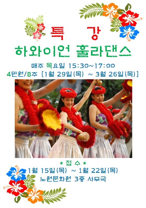 행사/소식 노원문화원 하와이언 훌라댄스 특강 안내 작성자: 관리자 등록일: 2015-01-16 조회수: 651 이전글 2015년 1분기 문화강좌 폐강 안내 다음글 2015년 노원애향장학회 장학생 선발계획 안내 목록