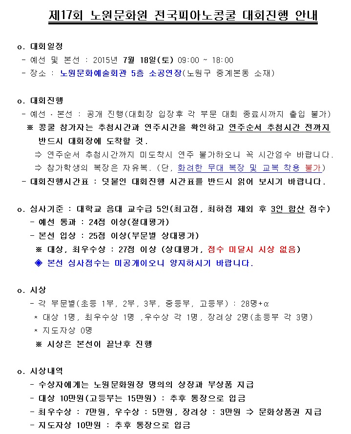 행사/소식 제17회 노원문화원 전국피아노콩쿨 대회진행 안내 작성자: 관리자 등록일: 2015-07-15 조회수: 883 이전글 제17회 노원문화원 전국피아노콩쿨 대회진행 시간표 다음글 2015. 서울특별시문화원연합회 청소년 사생대회 안내 목록