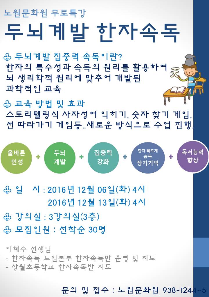 행사/소식 <어린이 무료특강>두뇌계발 한자속독 작성자: 관리자 등록일: 2016-11-22 조회수: 671 첨부파일 01 한자속독특강.jpg Download 이전글 2016.11.25(금) 작은도서관 휴관안내 다음글 2016.12.9(금) 창립기념일 휴원안내 목록