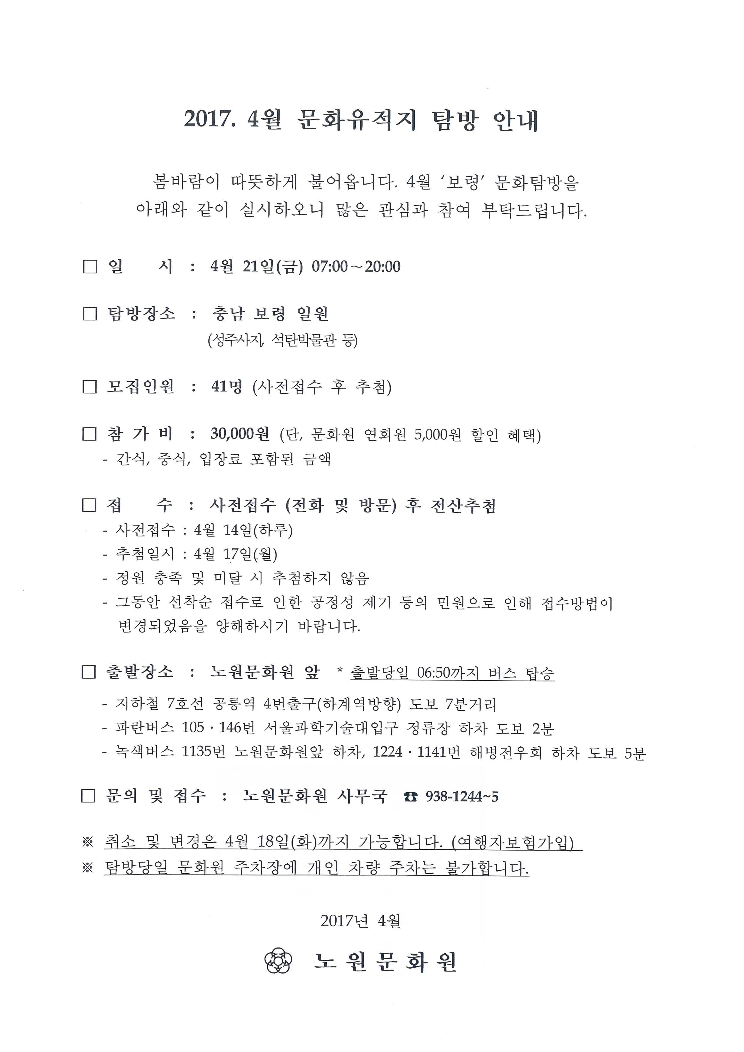 행사/소식 2017.4월 문화유적지 탐방 안내(4/21 충남 보령) 작성자: 관리자 등록일: 2017-04-07 조회수: 778 이전글 2017년 2기 문화강좌 폐강 안내 다음글 2017.태강릉 초안산 어린이 백일장 및 미술대회 수상자 명단 발표 목록