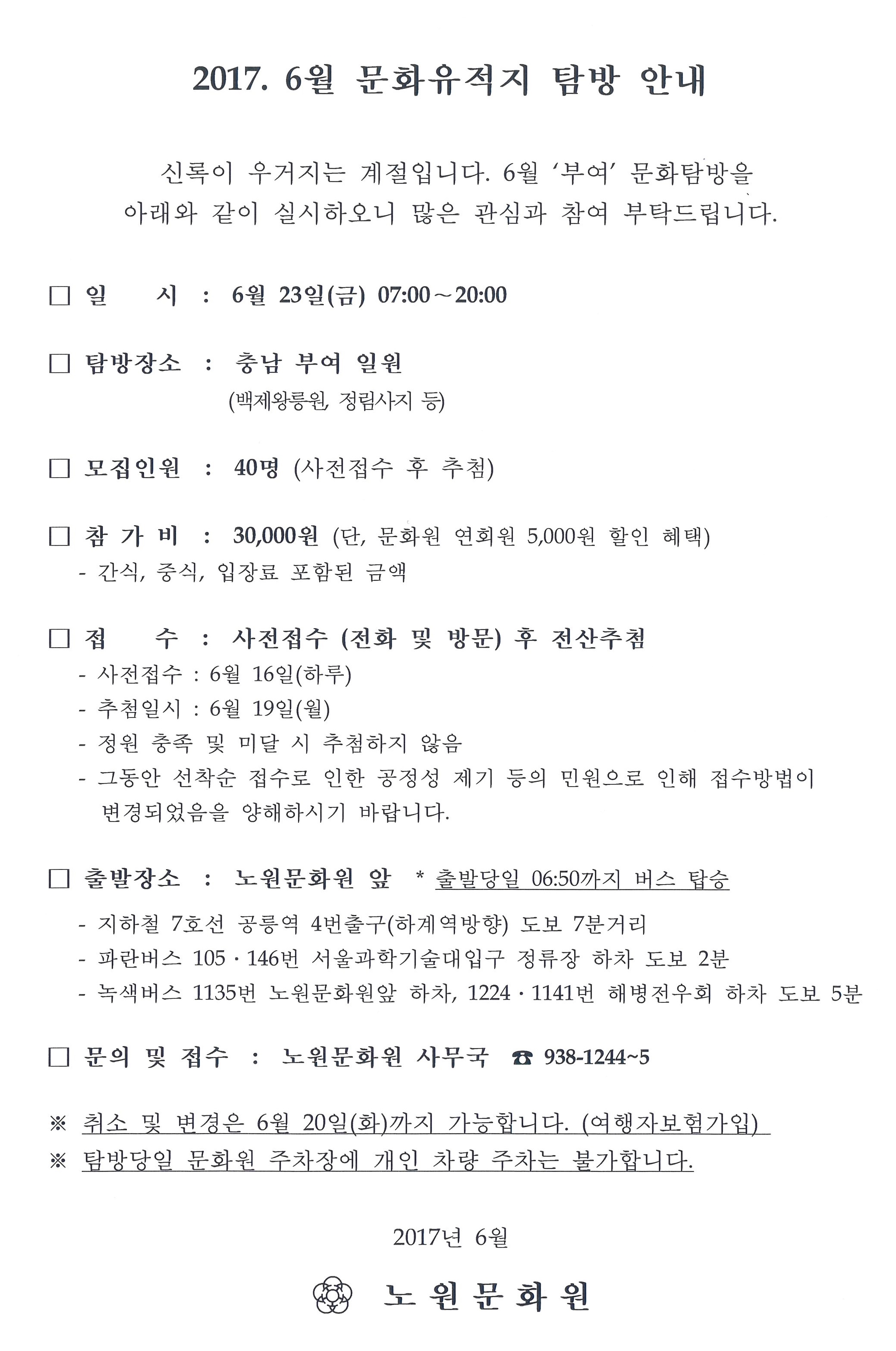 행사/소식 2017.6월 문화유적지 탐방 안내(6/23 충남 부여) 작성자: 관리자 등록일: 2017-06-14 조회수: 727 이전글 제19회 노원청소년문화예술제 수상자 발표 다음글 노원문화원 휴원안내 2017.07.01(토) 목록