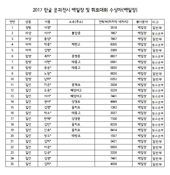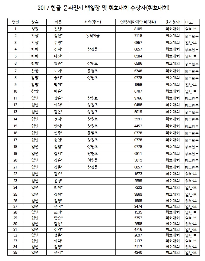 2017 한글 문과전시 백일장 및 휘호대회 수상자 발표