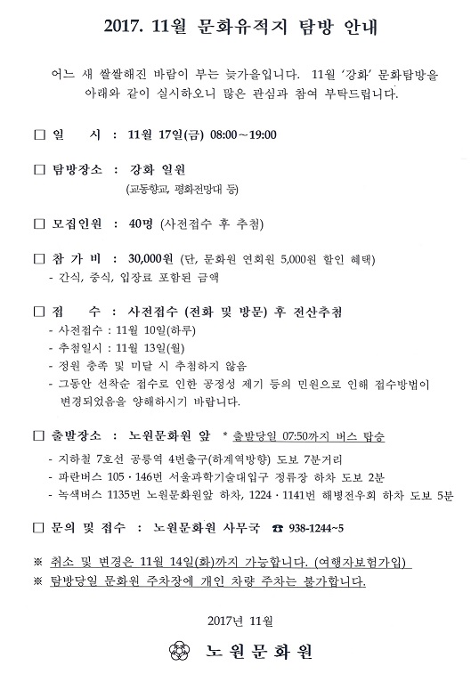행사/소식 2017.11월 문화유적지 탐방 안내(11/17 강화) 작성자: 관리자 등록일: 2017-11-07 조회수: 682 이전글 2017 한글 문과전시 백일장 및 휘호대회 수상자 발표 다음글 2018.1분기 문화강좌 개강일 변경안내 목록