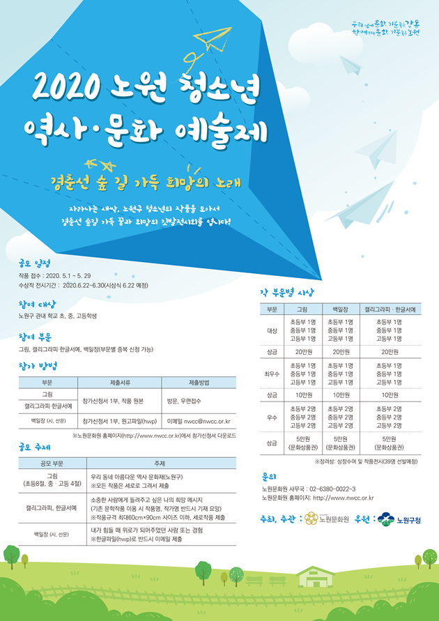 노원문화원(원장 박춘택)이 5월부터 1일부터 ‘2020 노원 청소년 역사문화예술제’ 공모를 시작한다. 전세계를 강타한 코로나19로 인해 사회적 거리두기가 이어지면서 문화예술 행사들이 취소, 연기 또는 축소되어 침체된 상황이다.