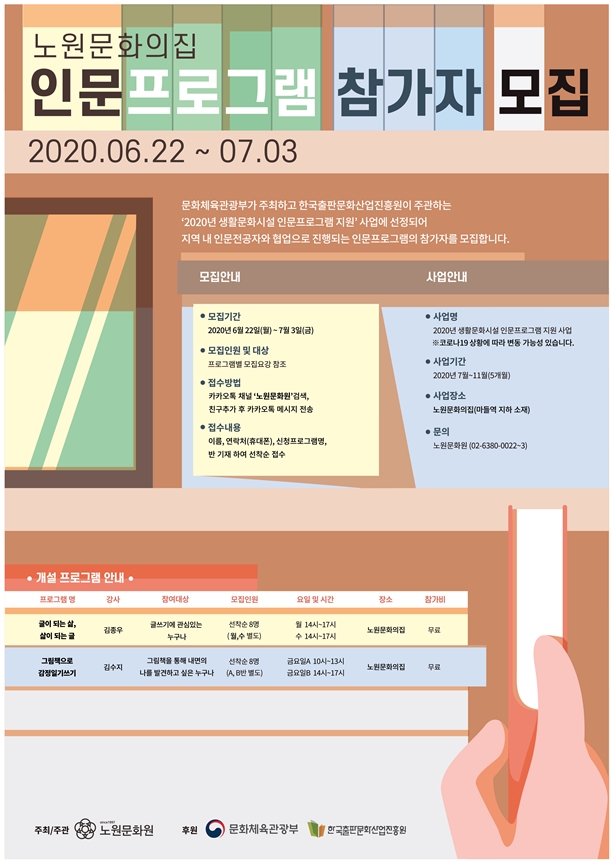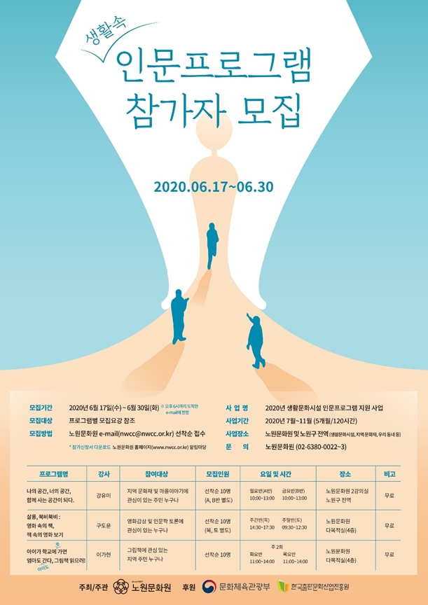 노원문화원은 2020년 7월부터 11월까지 5개월간 지역 내 인문전공자와 협업으로 진행하는 생활 속 인문프로그램을 운영한다.