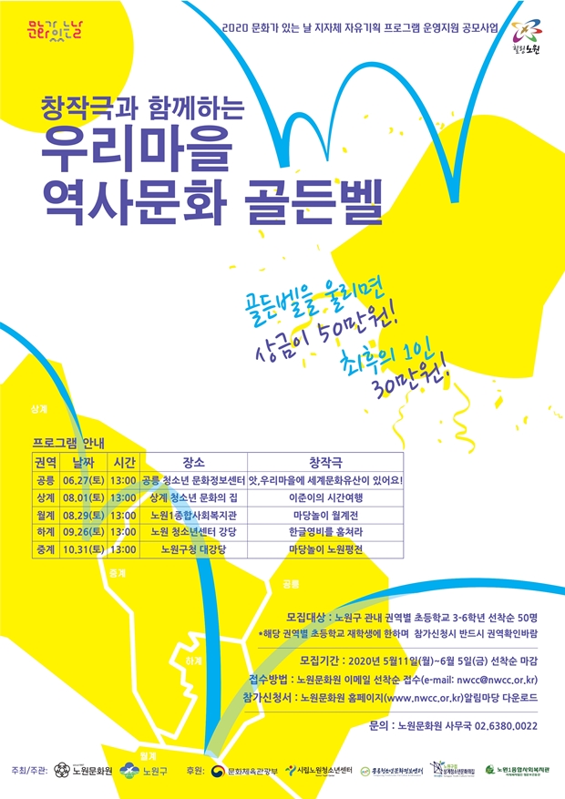 노원문화원이 2020 ‘문화가 있는 날’ 지자체 자유기획 프로그램을 진행한다. 6월 27일(토)부터 10월31일(토)까지 노원구를 5개 권역으로 구분하여 주민이 참여하는 역사문화 창작극 공연과 골든벨 행사를 개최한다.