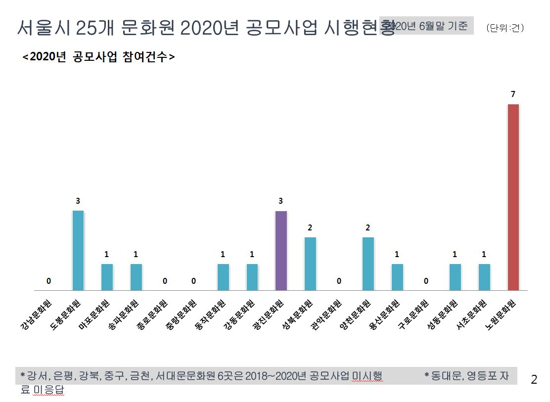 이번 조사는 노원문화원이 6월 18일부터 6월 24일까지 서울시 25개구 문화원을 대상으로 실시했다. 2018년부터 2020년까지 최근 3년간 각 문화원별로 시행한 공모사업 현황에 대한 서면자료를 요청했고, 동대문과 영등포문화원을 제외한 23개 문화원이 응답했다.