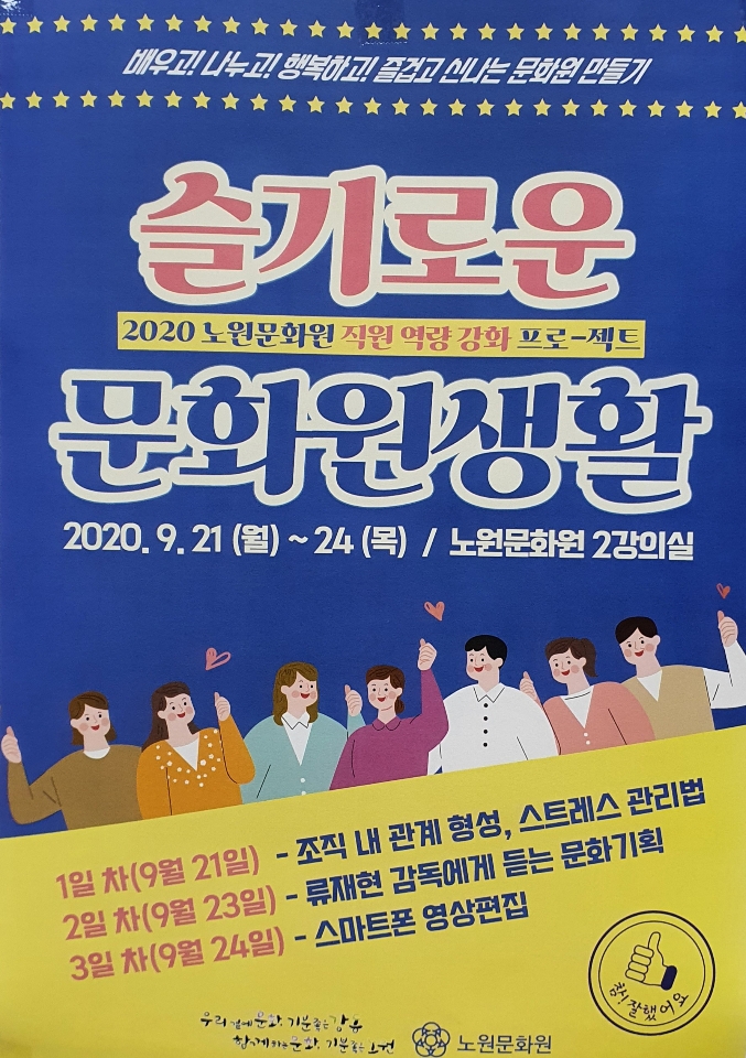 노원문화원(원장 박춘택)은 9월 21일(월) ~ 9월 24일(목) 까지 노원문화원 3층 2강의실에서 직원들의 발전과 성장을 위한 역량강화 교육을 실시했다.