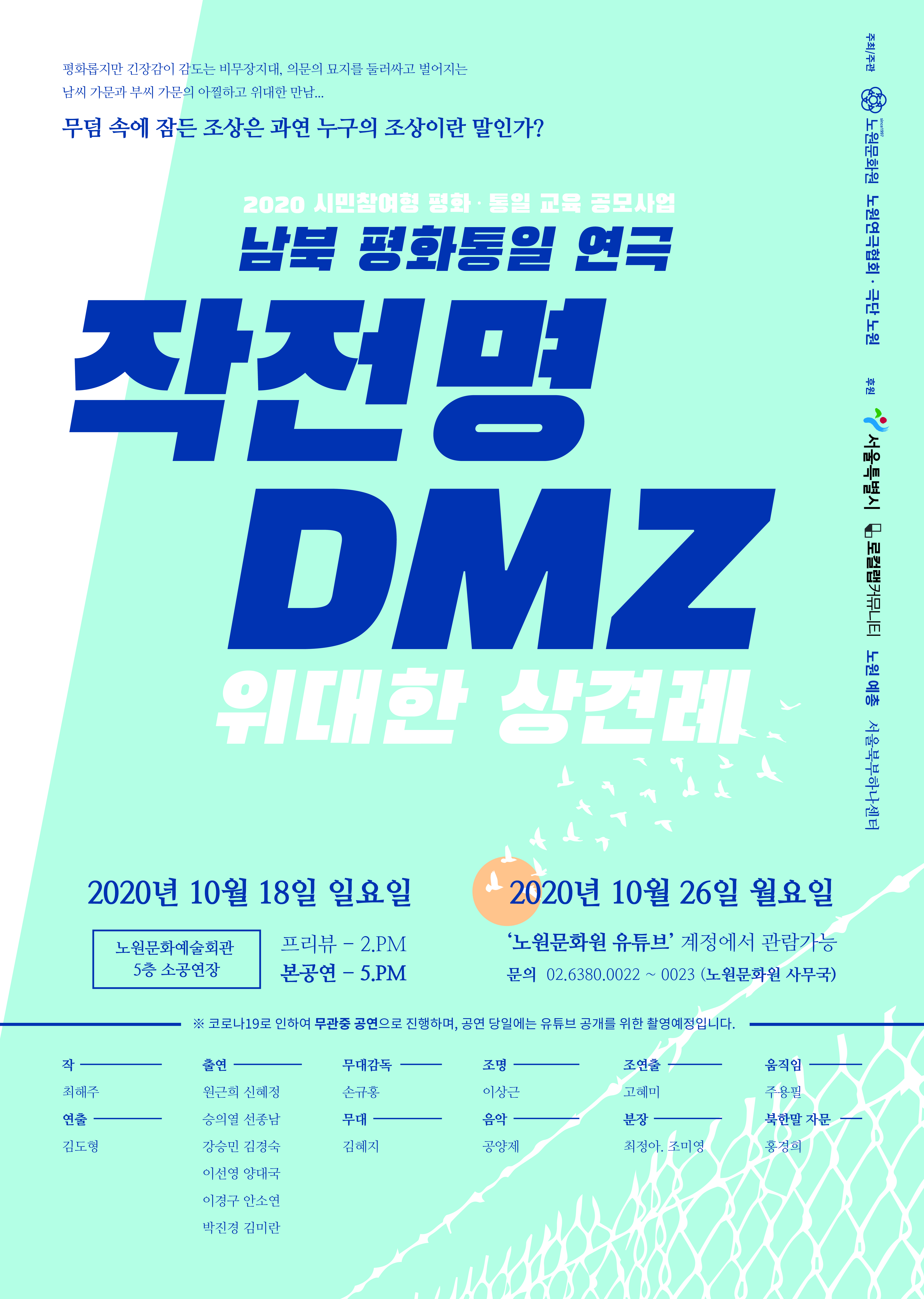 2020년 10월 18일, 노원문화예술회관 소공연장에서 노원문화원(원장: 박춘택)과 노원연극협회(회장 김도형)가 준비한 <작전명 DMZ>(부제: 위대한 상견례)가 펼쳐진다.