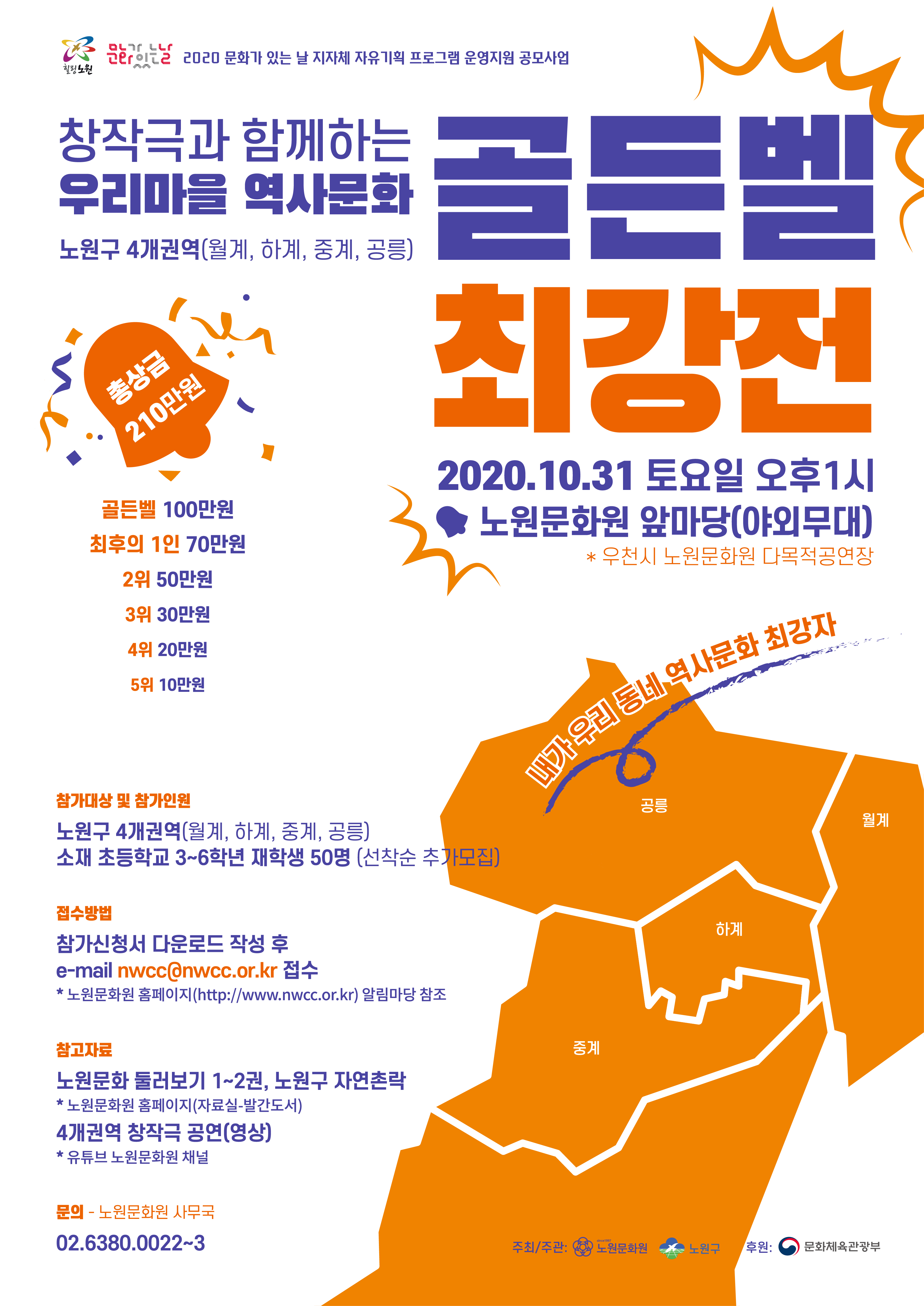 노원문화원은 10월 31일(토) 오후 1시부터 2020‘문화가 있는 날’ 지자체 자유기획 프로그램인 ‘창작극과 함께 하는 우리 마을 역사문화 골든벨 최강전’을 개최한다.